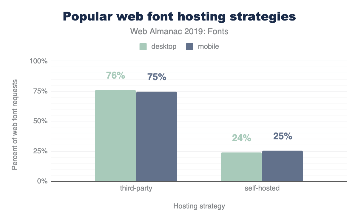 The fact that three quarters are hosted is perhaps unsurprising given Google Fonts dominance that we will discuss below.