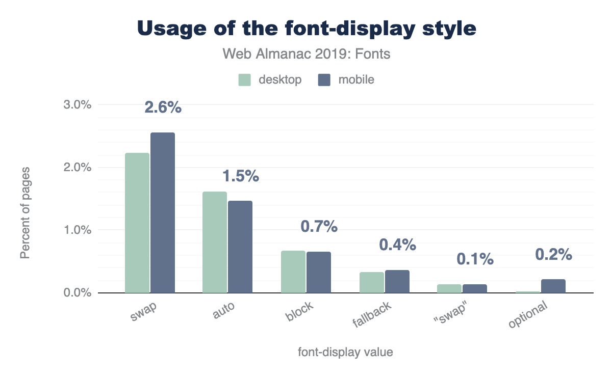 swap, 1.5% to auto, 0.7% to block, 0.4% to fallback, 0.2% to optional, and 0.1% to swap enclosed in quotes, which is invalid. The desktop distribution is similar except swap usage is lower by 0.4 percentage points and auto usage is higher by 0.1 percentage points.font-display values.