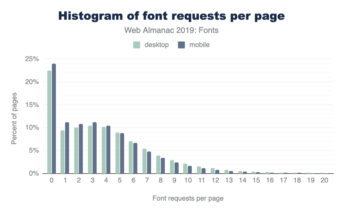 The median web page makes three web font requests. At the 90th percentile, requested six and nine web fonts on mobile and desktop, respectively.