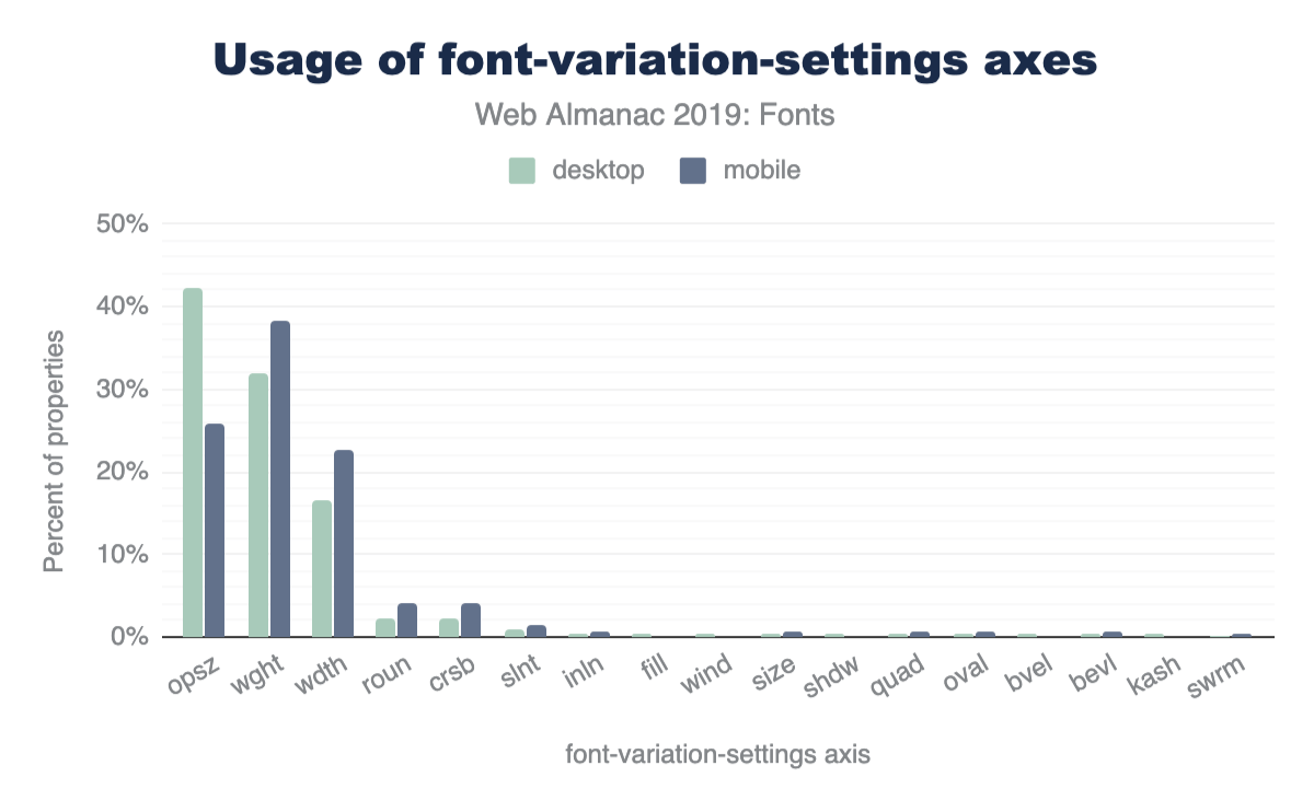 opsz value, 32% to wght, 16% to wdth, 2% or fewer to roun, crsb, slnt, inln, and more. The most notable differences between desktop and mobile pages are 26% usage of opsz, 38% of wght, and 23% of wdth.font-variation-settings axes.