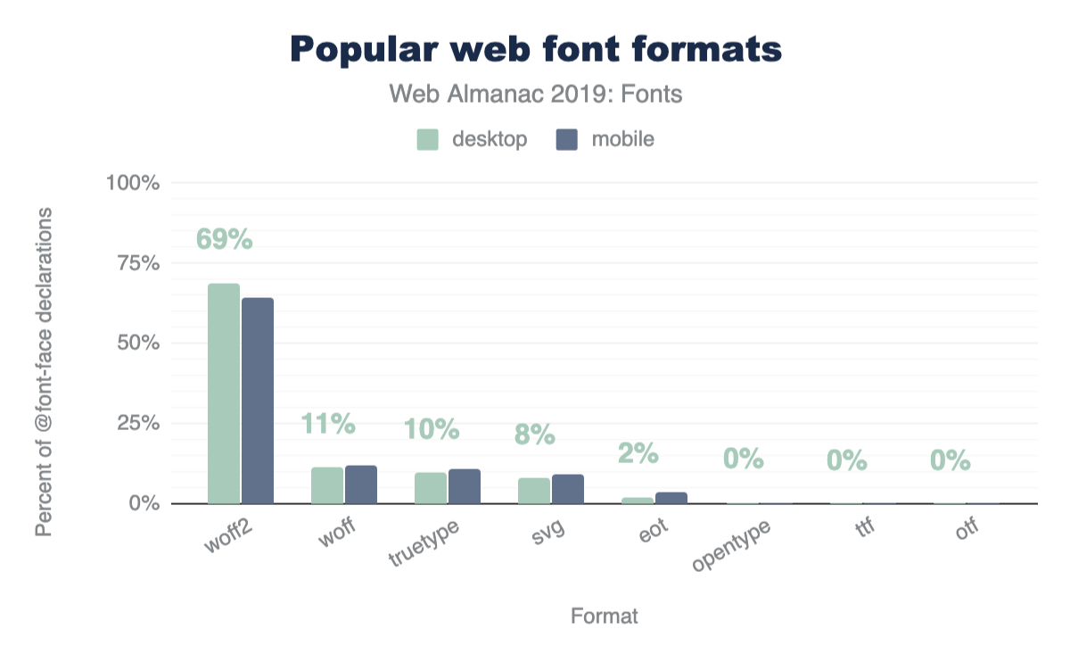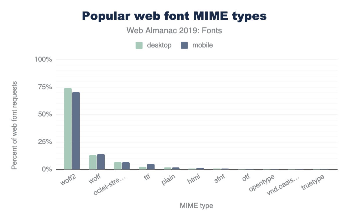 From my perspective, an argument could be made to go WOFF2-only for web fonts after seeing the results here. I wonder where the double-digit WOFF usage is coming from? Perhaps developers still serving web fonts to Internet Explorer?