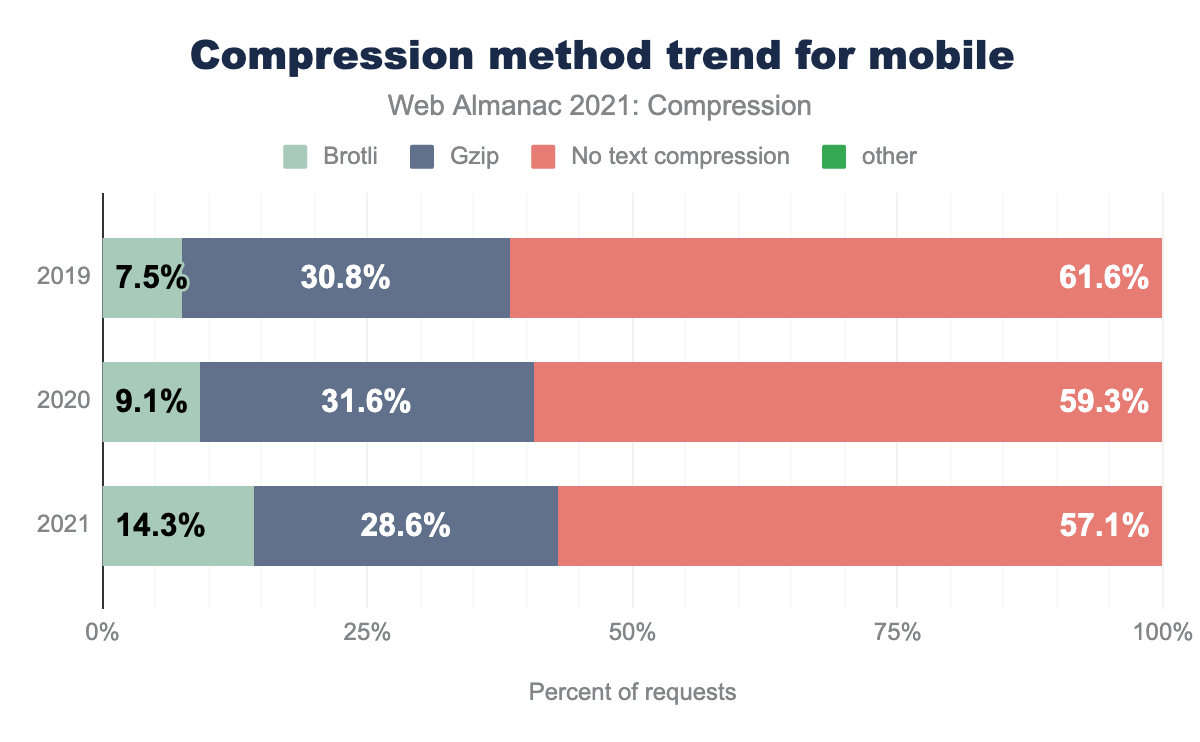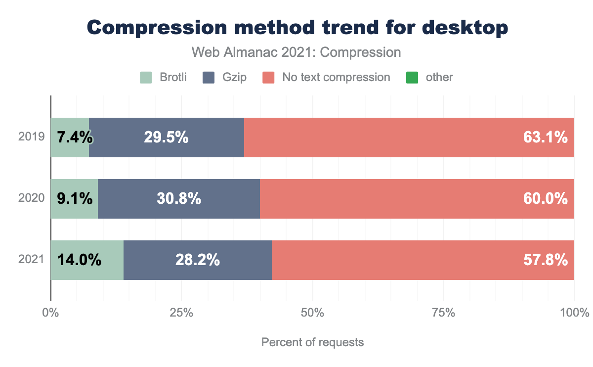 The graph below shows the usage share trend of lossless compression from the HTTP Archive metrics over the last 3 years. The usage of Brotli has doubled since 2019, while the usage of Gzip has slightly decreased, and overall the use of HTTP compression is growing on desktop and on mobile.