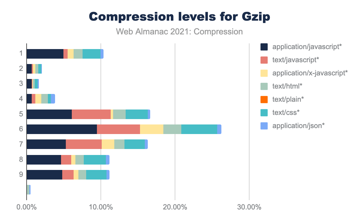 opt which corresponds to optimizers such as Zopfli. It shows peaks at level 1 and at level 6 extending through level 9. Each level is also broken down by content type.The figure breaks down each compression level by content type. JavaScript is the most common content type in almost all cases. For Brotli, the proportion of JavaScript in the highest compression levels is higher than in the lower compression levels, while JSON is more common in the lower compression levels. For Gzip, the distribution of the JavaScript content type is roughly equal at all levels.