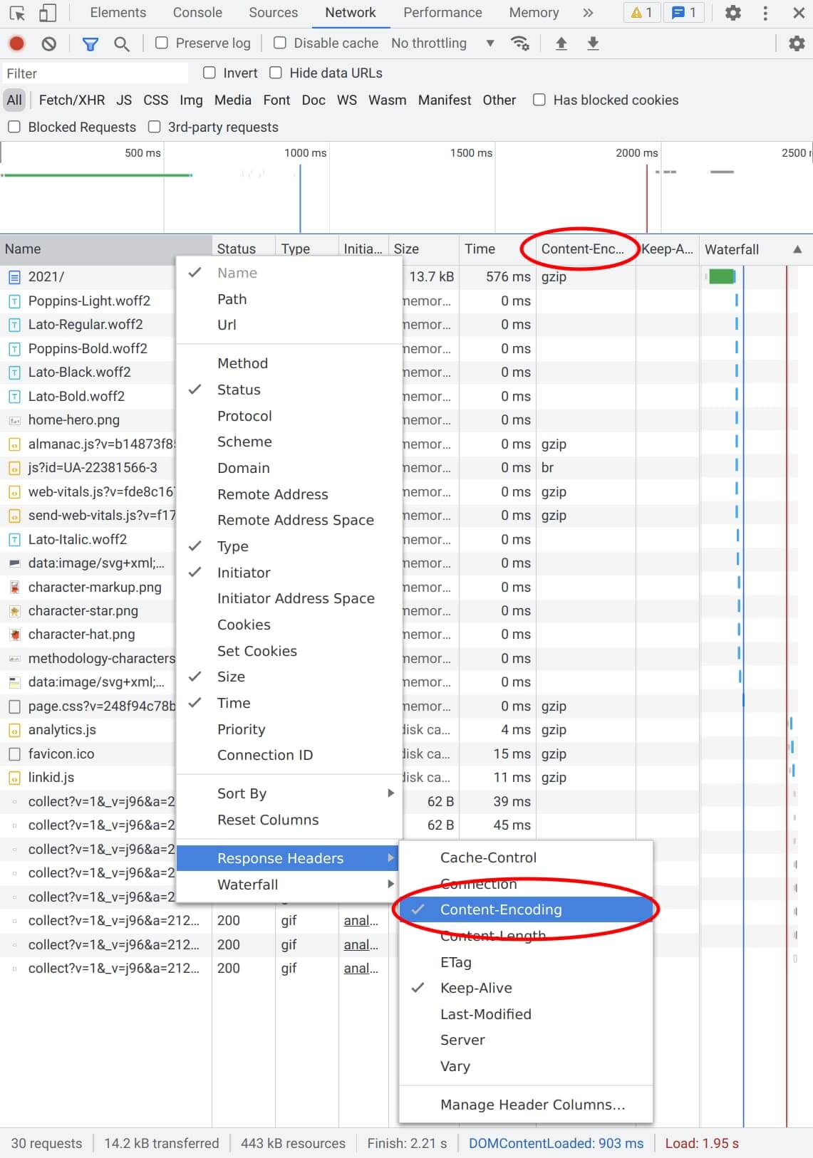 To check which content of a website is using HTTP compression, the Firefox Developer Tools or the Chrome DevTools can be used. In the developer tools, open the Network tab and reload your site. A list of responses such as HTML, CSS, JavaScript, fonts and images should appear. To see which ones are compressed, you can check the content encoding in their response header. You can enable a column to easily see this for all responses at once. To do this, right click on the column titles, and in the menu navigate to Response Headers and enable Content-Encoding.