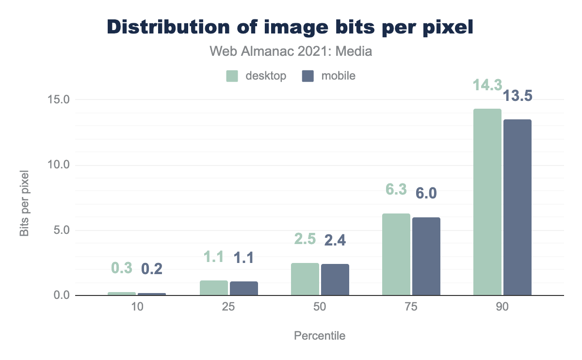 Bytes and dimensions are interesting on their own, but to get a sense of how compressed the web’s image data is, we need to put bytes and pixels together, to calculate bits per pixel. Doing so allows us to make apples-to-apples comparisons of the information density of images, even if those images have different resolutions.