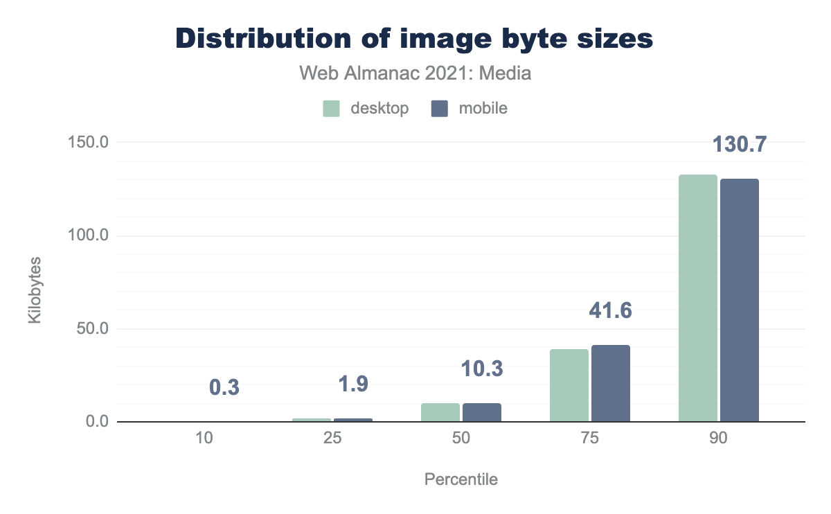 The median contentful <img> weighs in at just over 10kB. But, again, the median page contains more than 15 <img>s so, when looking at the ninetieth percentile of all images across pages, images that push past 100kB aren’t rare at all.