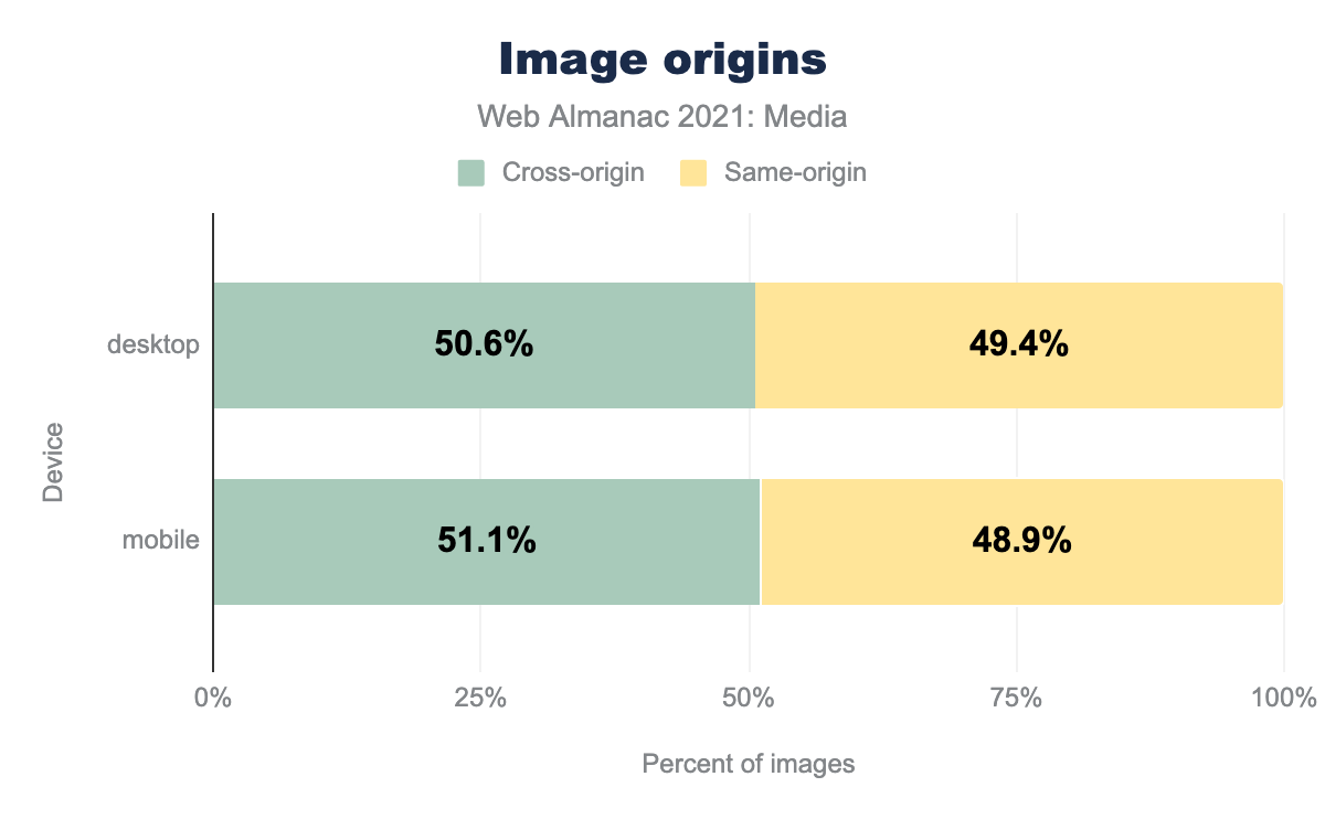 Cross-origin images are subject to significant security restrictions, and can sometimes incur performance costs. On the other hand, moving static assets to a dedicated CDN is one of the most impactful things you can do to help Time to First Byte, and image CDNs provide powerful transformation and optimization features which can automate all sorts of best-practices. It would be fascinating to see how many of the 51% of cross-origin images are hosted on image CDNs and to compare their performance against the rest of the web’s. Unfortunately, that was outside the scope of our analysis.