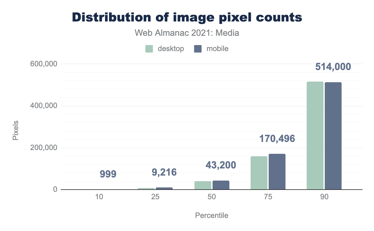 I was also surprised that there was almost no difference between desktop and mobile at the top end of the pixel count distribution. Initially, this seemed to indicate a lack of effective adoption of responsive image features, but when you consider that the mobile crawler has a 360 × 512px @3x viewport (so 1,080 by 1,536 physical pixels), while the desktop viewport is 1,376 × 768px @1x, it isn’t actually surprising: the crawlers’ viewports had similar widths, in physical pixels (1,080 vs 1,376). A bigger difference in physical pixel resolution between the crawlers would be more revealing.