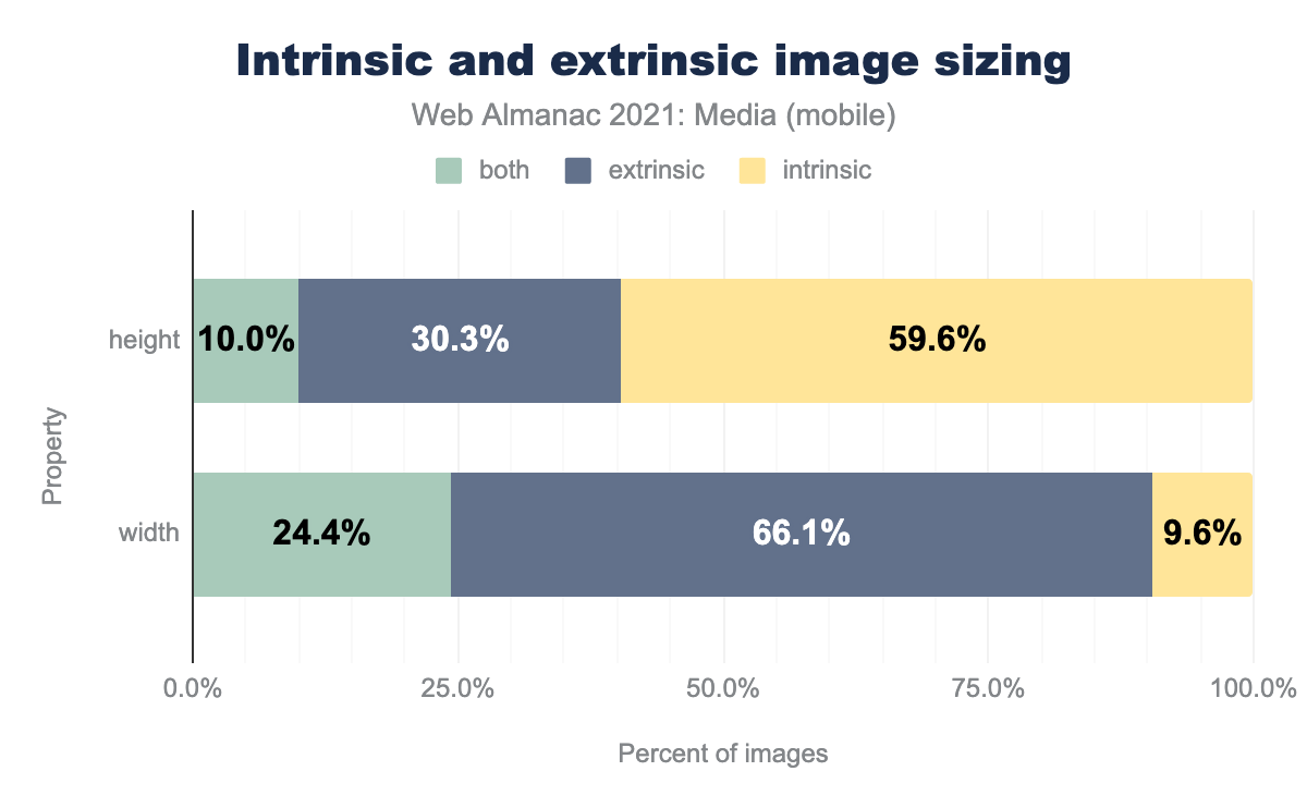 The question is a little complicated because some images (those with a max-width, max-height, min-width, or min-height constraint), are sometimes extrinsically sized, but sometimes left to their intrinsic size. We’ve labelled those images as “both.”
