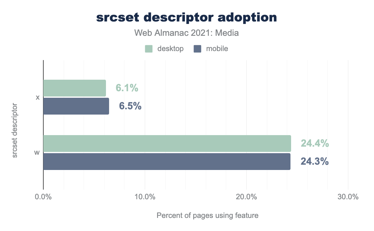 Note that throughout the rest of this analysis, we have excluded single pixel <img>s from the results. For this media chapter, we’re interested in <img> elements that are presenting visual information to the user, not tracking pixels or layout hacks.
