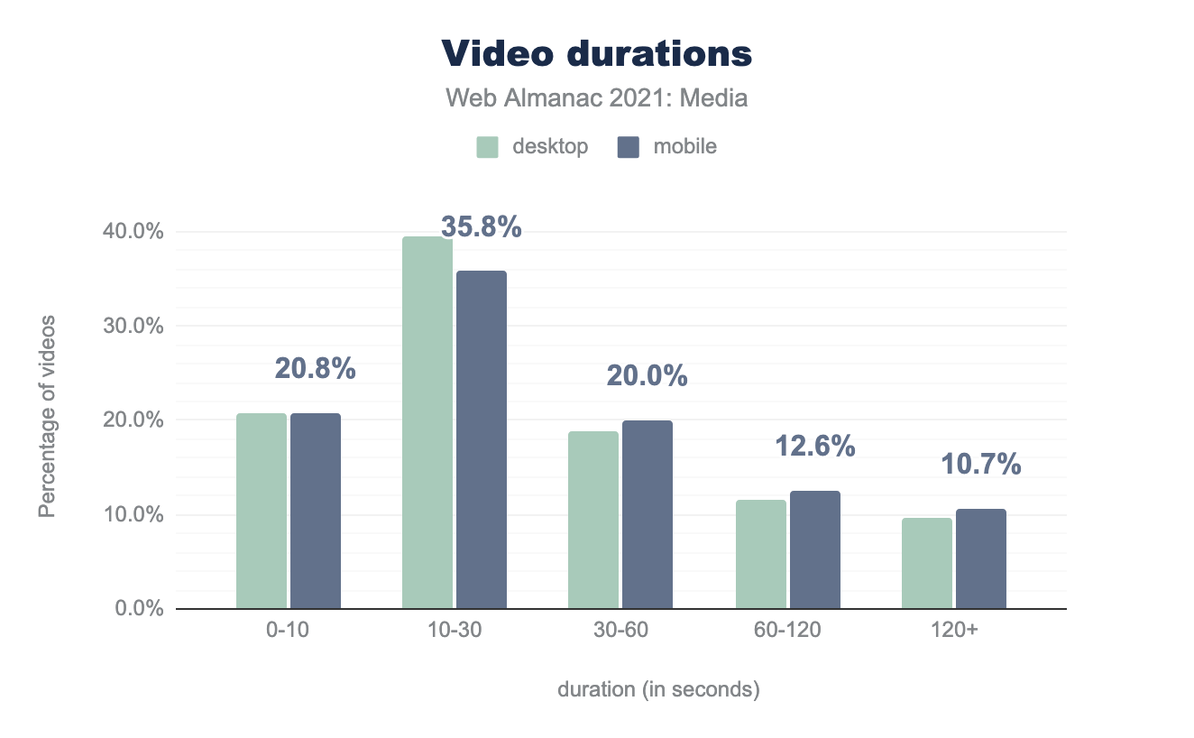 Most videos on the web are short: ~ 60% of videos are under 30 seconds long on both mobile and desktop. However, 12-13% are between one and two minutes, and 10% of videos are over two minutes long.
