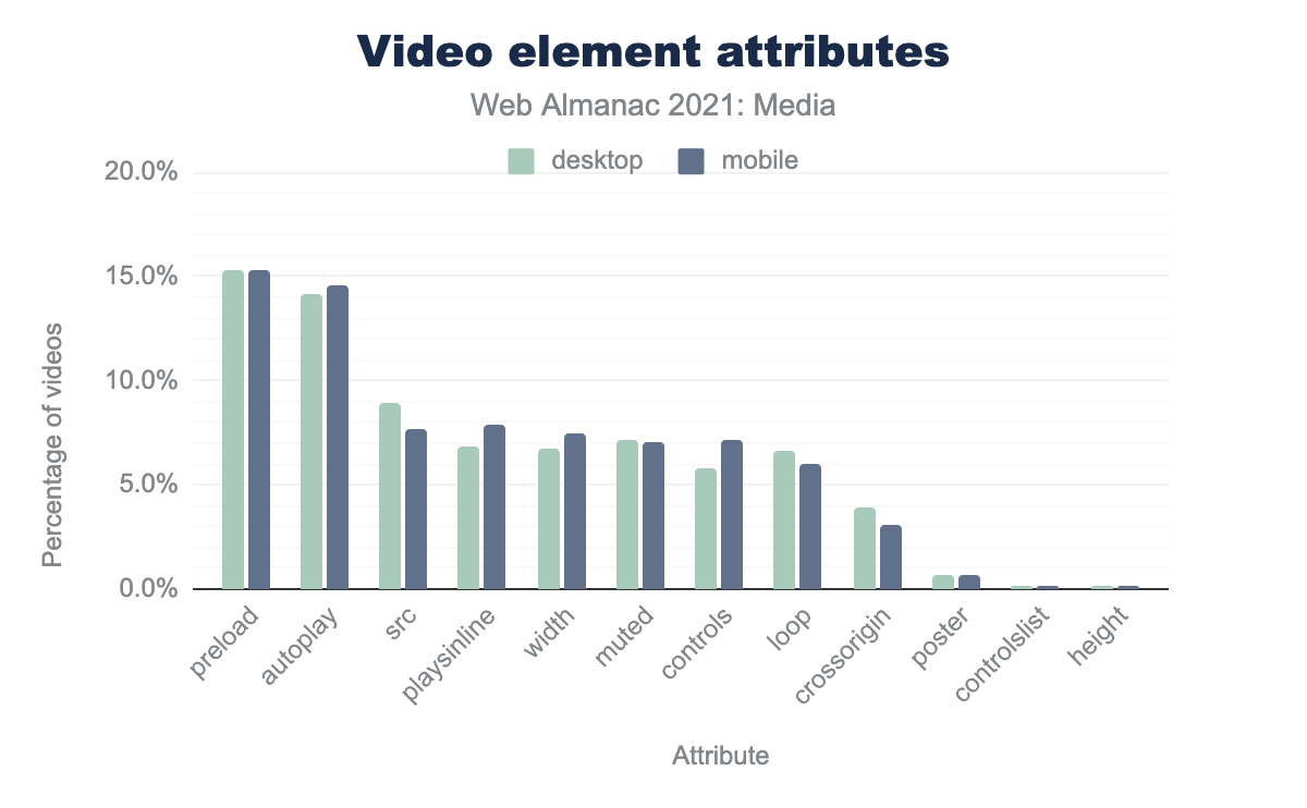 Interestingly, we see a large push away from preload on both mobile and desktop. While it is possible that this changed for many videos, it could just be that the new videos added to the web over the last year do not utilize this setting. From a page weight perspective this is a large win for the web.