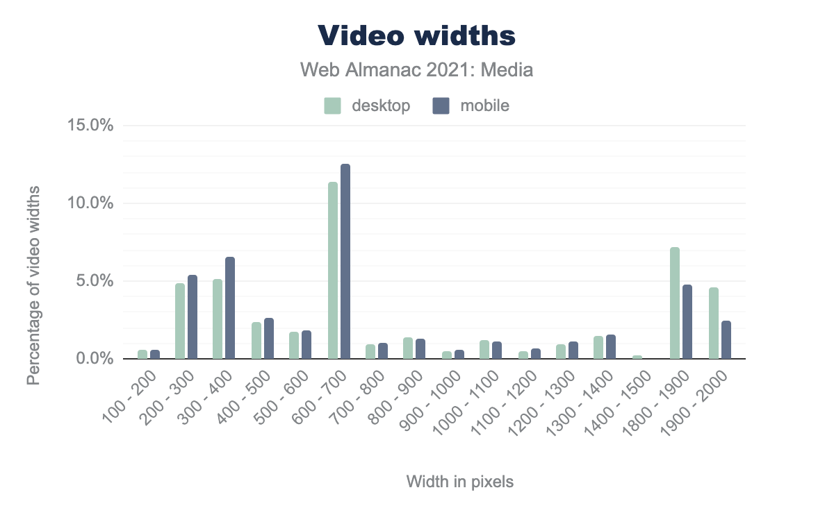 • When a width in pixels is defined, we see very similar numbers of videos at lower widths, but a large drop-off in the 1800 and 1920 widths: