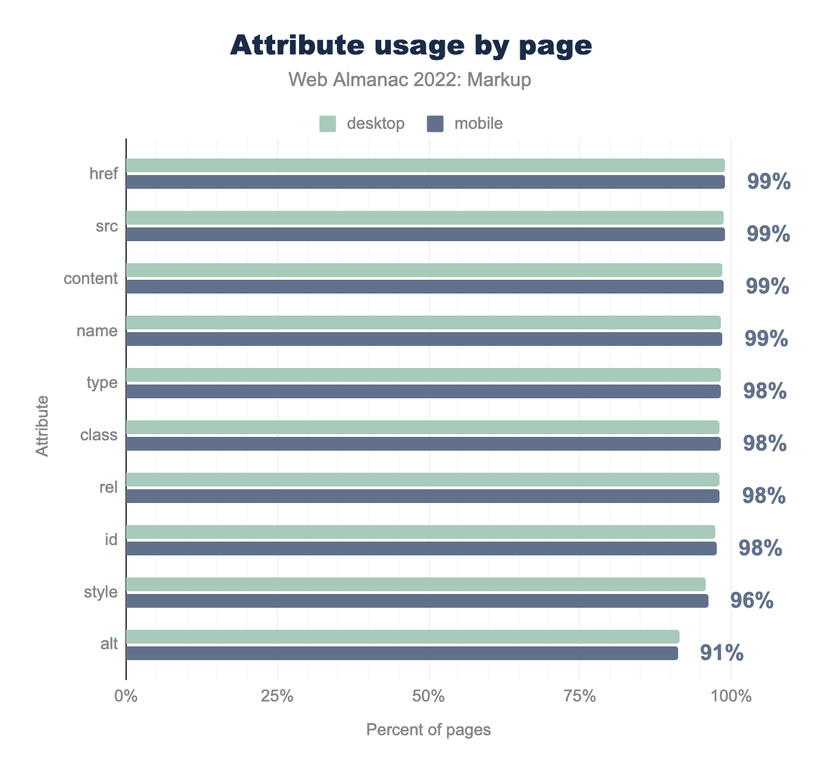 href is used on 99% of desktop and mobile pages, src on 99% of both, content on 98% of desktop and 99% of mobile, name on 98% and 99% respectively, type on 98% of both, class on 98% of both, rel on 98% of both, id on 97% and 98% of mobile, style on 96% of both, and finally alt is used on 91% of both.href, src, content (metadata), and name (metadata, form identifiers) are present on nearly every document in our sample.