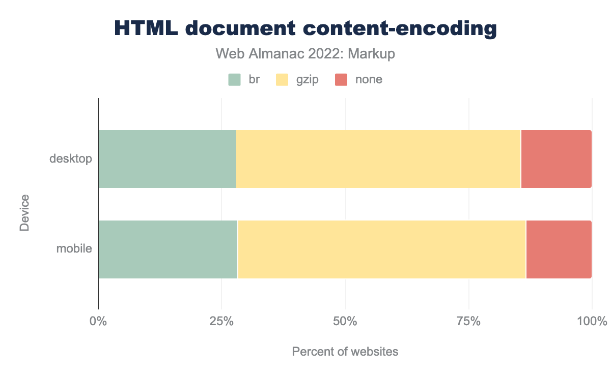 Are HTML documents being compressed? How many? How? 86% of them are—with 58% (down 5.8% since last year) overall being gzip-compressed, and 28% (up 6.1%) being compressed using Brotli. Overall, slightly more documents are being compressed, and compressed more effectively.