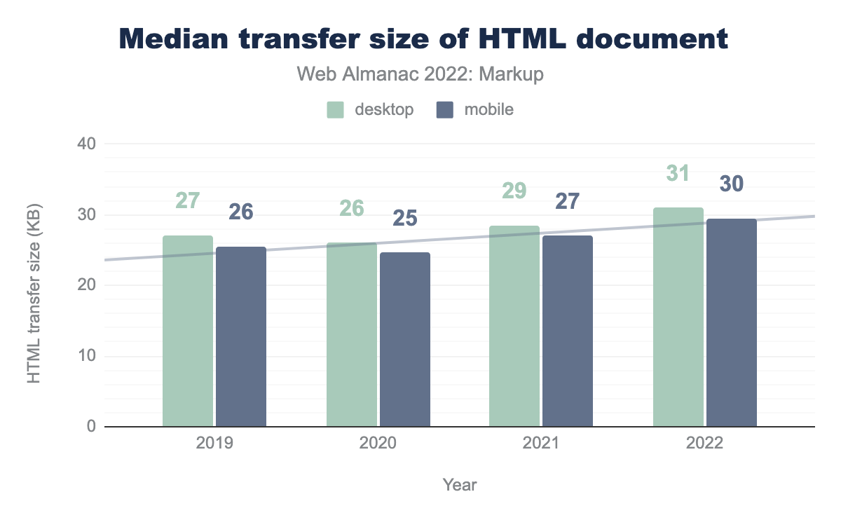 After some brief relief in 2020, document size has continued growing in 2021, and again in 2022, with a median transfer size of 30 kB in our mobile data set.