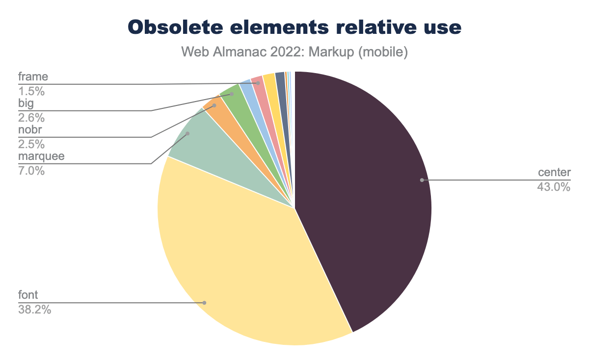 center is 43.0% of obsolete element usage on mobile, font is 38.2%, marquee is 7.0%, nobr 2.6%, big 2.6%, frame 1.5% and the rest of the pie is made up of unlabelled other elements.Attributes