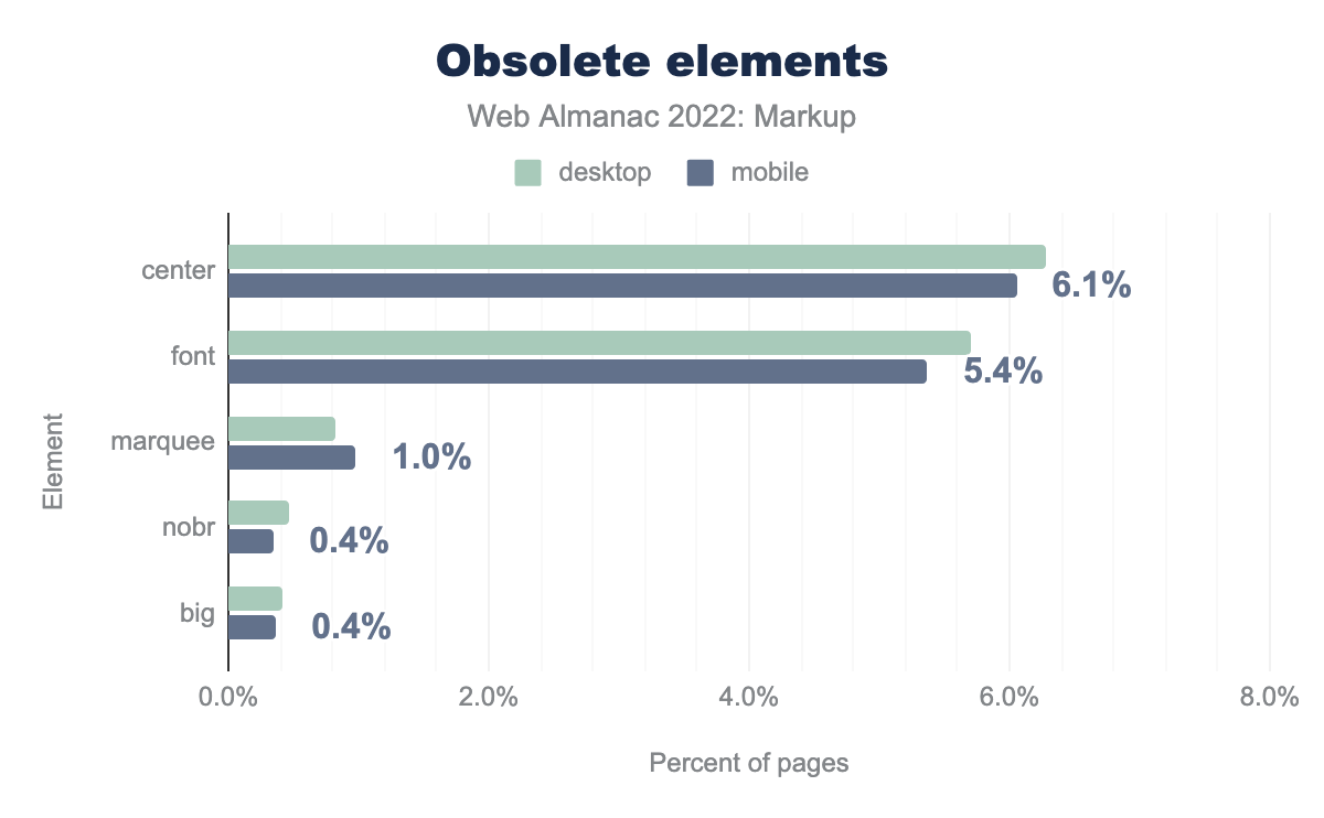 center is used on 6.3% of desktop and 6.1% of mobile pages, font is used on 5.7% and 5.4% pages respectively, marquee on 0.8% and 1.0%, nobr on 0.5% and 0.4%, and finally big 0.4% of desktop and mobile pages.On 6.1% of pages, you still find center elements (hi Google home page), and on 5.4% of pages, you find font elements. Use of both elements went down (down 0.5% in both cases), fortunately, while marquee, nobr, and big didn’t witness significant changes.