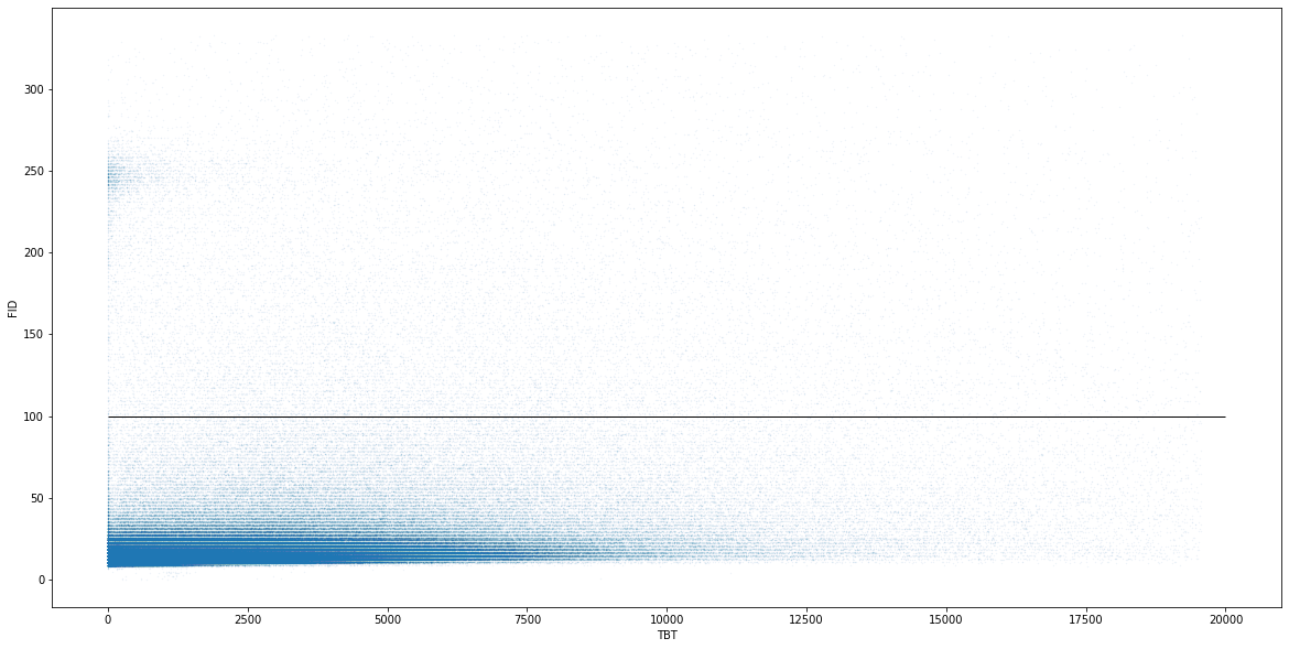 Pages in this chart are more densely packed in the bottom left corner, which signifies the higher degree of correlation between FID and TBT. There’s still a smear, but it’s not as pronounced.