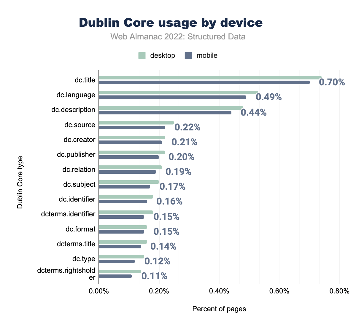 Other than that, Dublin Core types are similar between mobile and desktop pages, sharing the same slight increase in appearances compared to the previous year.