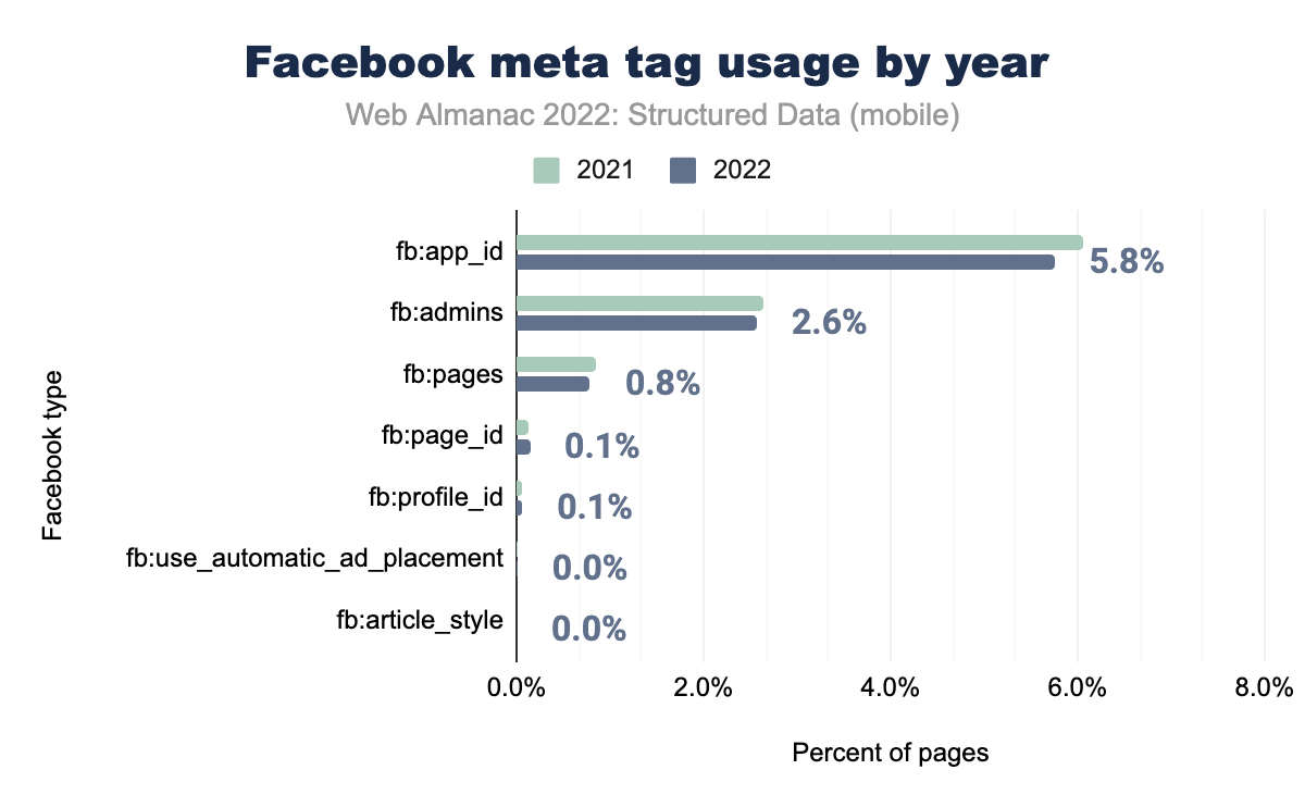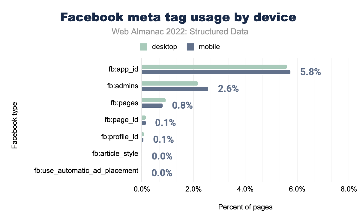Out of all of the Facebook tags here, there are only three with significant numbers of appearances. These are the same as the top three in 2021, namely fb:app_id, fb:admins and fb:pages at 5.8%, 2.6% and 0.8% on mobile, all a slight decrease from last year.