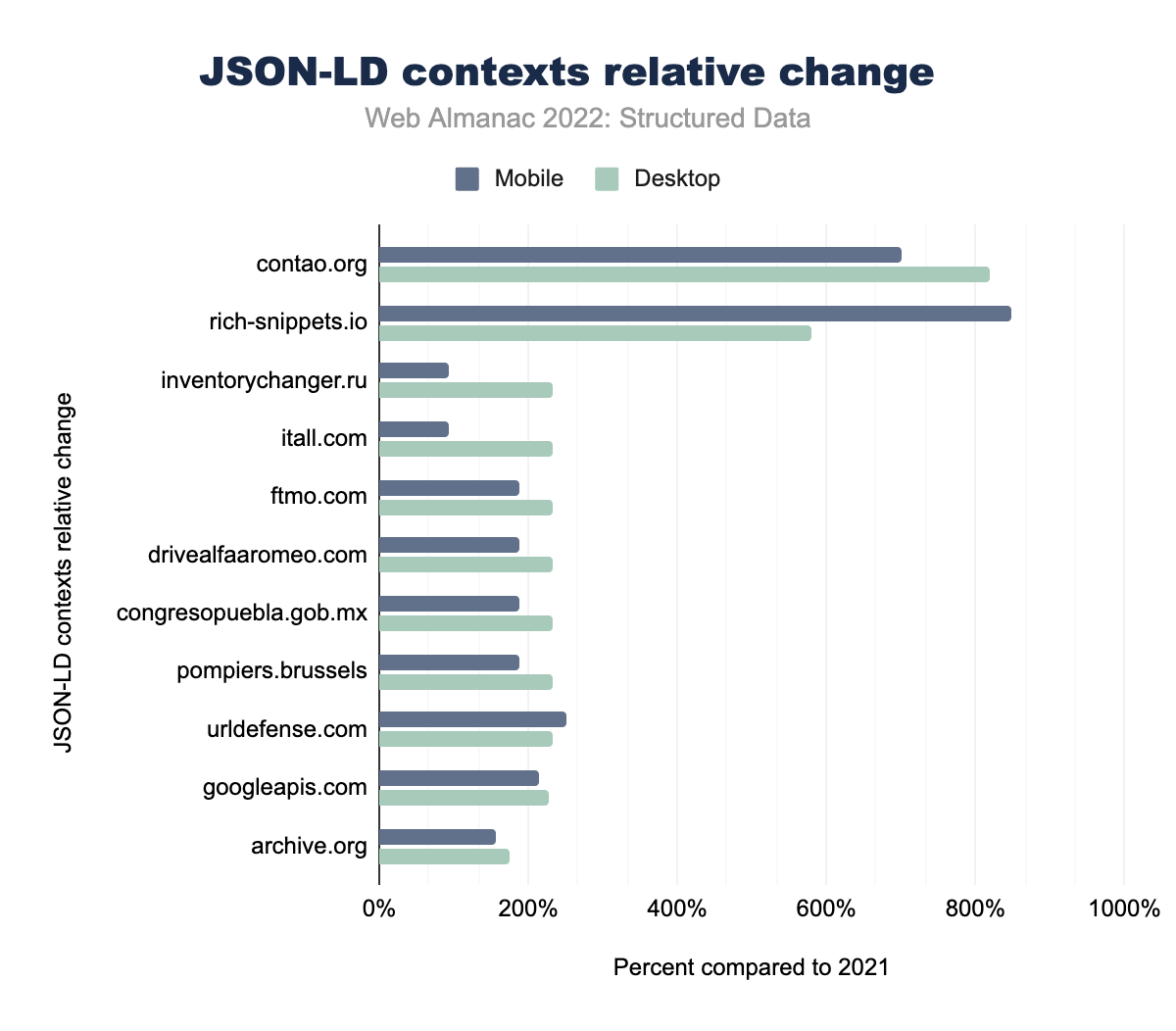 For JSON-LD contexts, schema.org is by far the largest contributor, with over 6,000 times as many appearances for desktop pages and over 3,500 times as many appearances for mobile pages than the second largest contributor, googleapis.com. With that said, googleapis.com’s appearances more than doubled for both desktop and mobile pages, compared to schema.org’s more modest increase to 108% of last year’s numbers. In terms of top growers, contao.org and rich-snippets.io take the top spots with contao.org’s desktop page increase of 819% and rich-snippets.io’s mobile increase of 849%. Contao.org ranks 4th in total entries, while rich-snippets.io ranks at 8th.