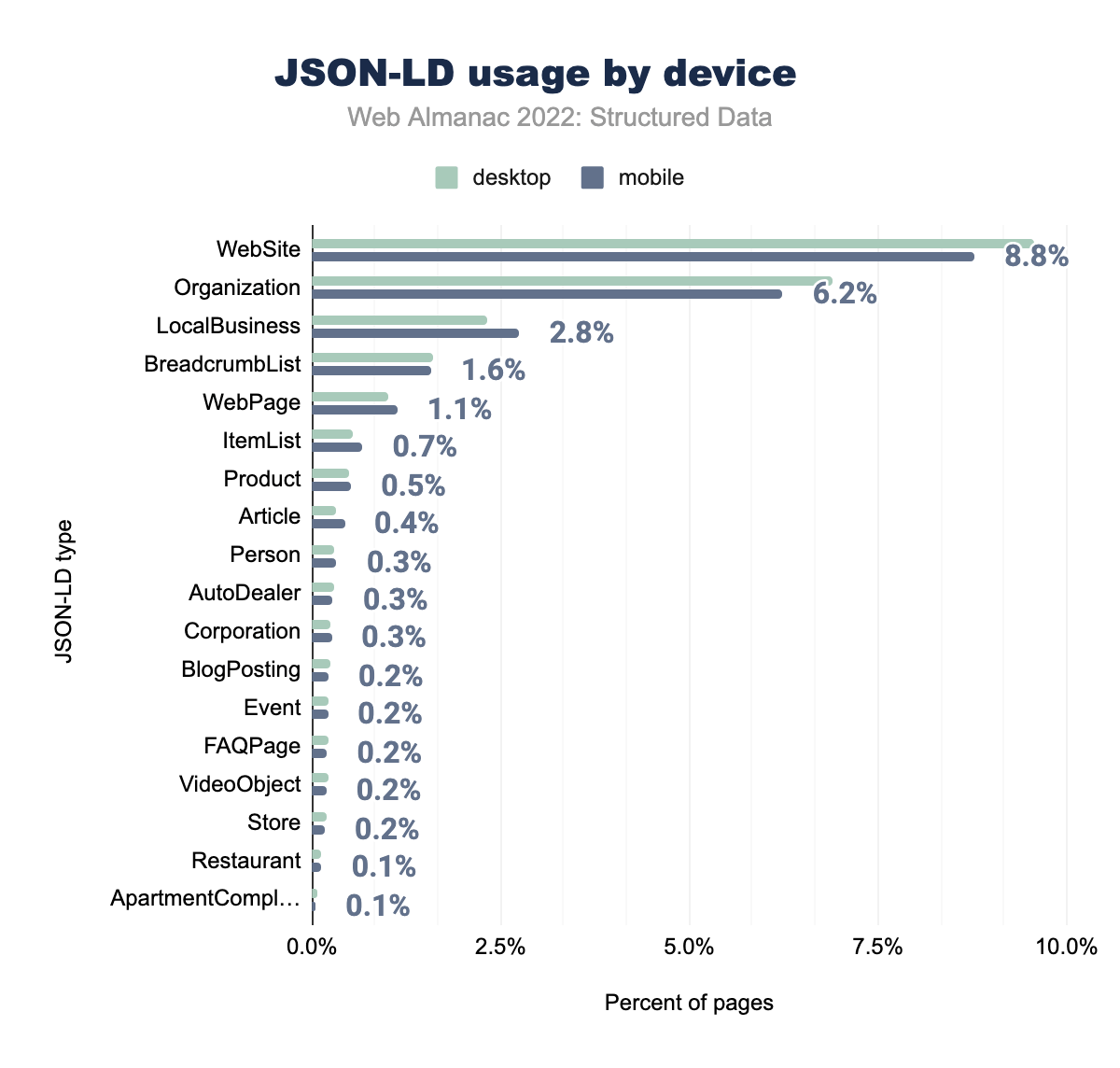 JSON-LD types continue to be mostly similar with a few notable increases over the previous year. Namely, these are LocalBusiness (which has increased to 2.8% of pages in our set) and Restaurant (which has increased to 0.3% of pages in our set).