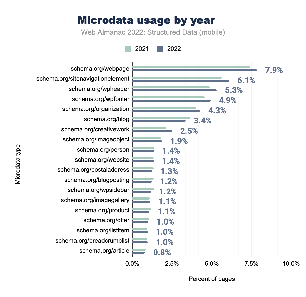 This is the second year that the Web Almanac has included a chapter on structured data. Last year’s content gave a solid grounding in the concept of structured data, outlining the reason it exists, the most frequently used types, and how it benefits organizations. This year we compared data gathered in 2022 with the previous data from last year, so were able to monitor trends that occurred within that period.