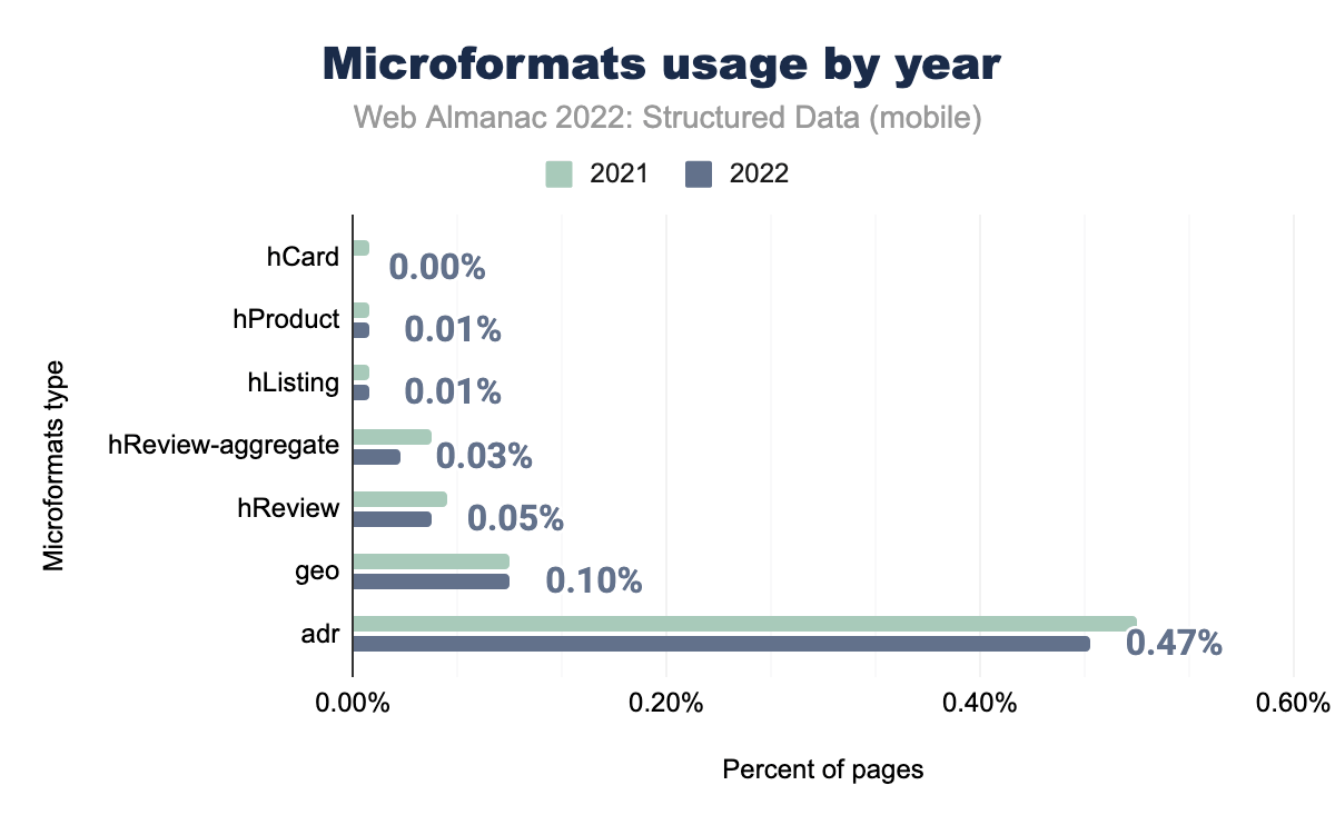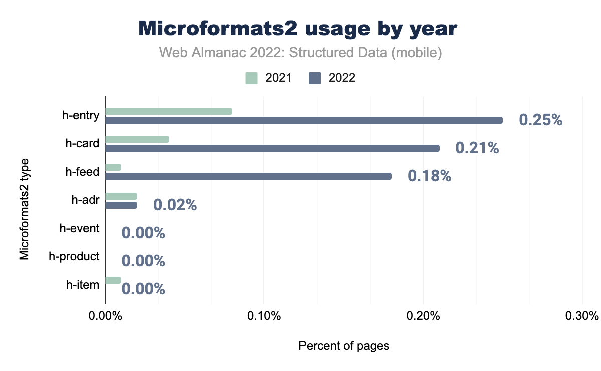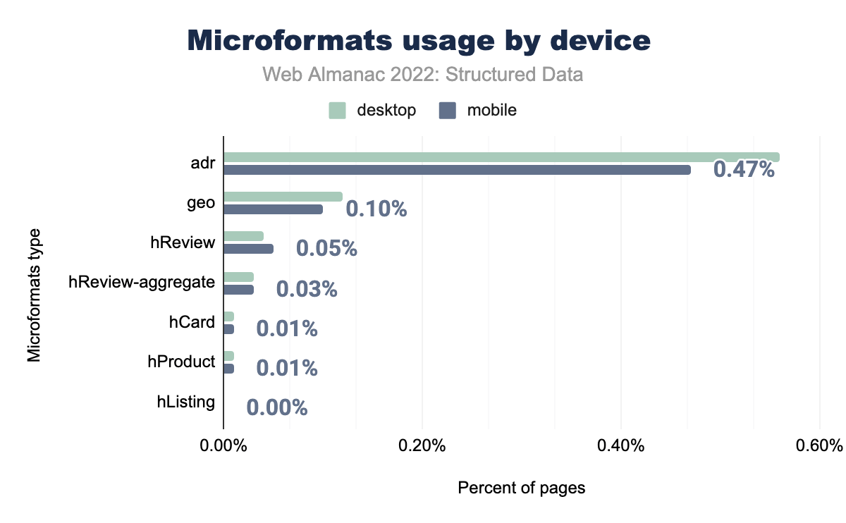 Both mobile and desktop share a mix of increased and decreased usage between microformat types, though both averaging out to less than last year’s numbers. Some types which factor into this decrease are hReview (going from 0.06% to 0.05% on mobile pages and 0.06% to 0.04% on desktop pages) and hReview-aggregate (going from 0.06% to 0.04% on both mobile and desktop pages).