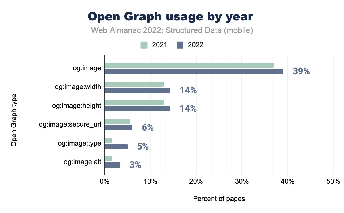 We have seen an increase in use for each Open Graph type in the top 10 for both mobile and desktop, resulting in Open Graph’s relative growth of 1.5% since 2021.