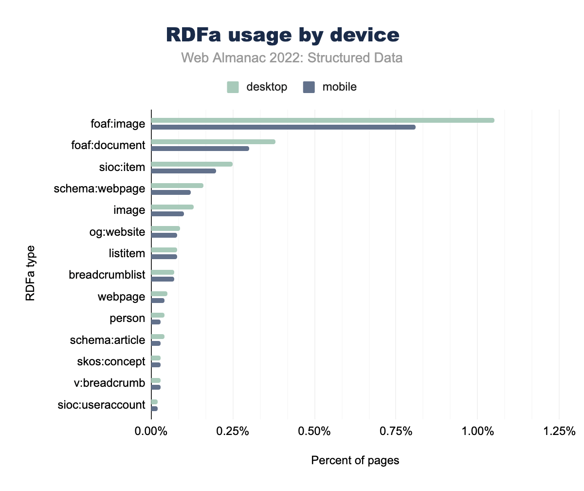 RDFa remains more prominent on desktop with foaf:image appearing on 1% of desktop pages, compared to 0.81% on mobile pages. Other RDFa types saw a slight increase in appearance on desktop pages over mobile, with the exception of og:website reaching ahead with 0.08% on mobile pages and 0.07% on desktop pages.