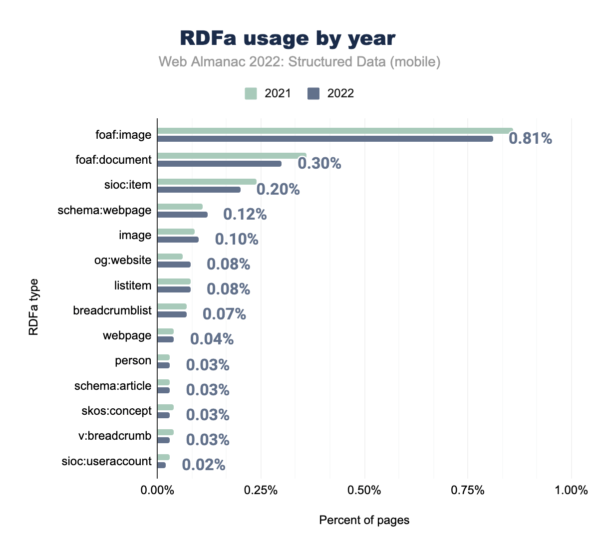 When evaluating the types of RDFa, foaf:image remains present on more pages than any other type, though it has shown a decrease in the percent of pages in our set since 2021. This applies to the next two types, foaf:document and sioc:item, with small decreases in usage. Many of the other types show a slight increase in usage, as RDFa has seen as a whole.