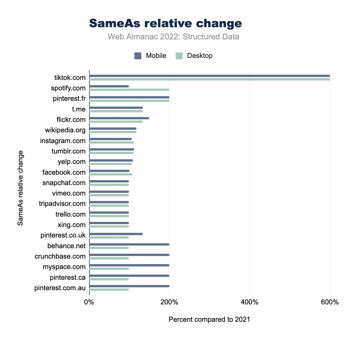 It is insightful to look at the SameAs entries and how they change over time. TikTok has seen a huge increase with 2022 showing its appearance on six times as many pages relative to our set compared to 2021. This change is equal for both desktop and mobile pages. Pinterest, and the various domain names it has, make up for 3 of the top 5 largest growth for mobile pages in 2022. Mobile overall has seen a larger increase for SameAs entries than desktop, with Spotify being an exception with its desktop page appearances being doubled compared to 2021.
