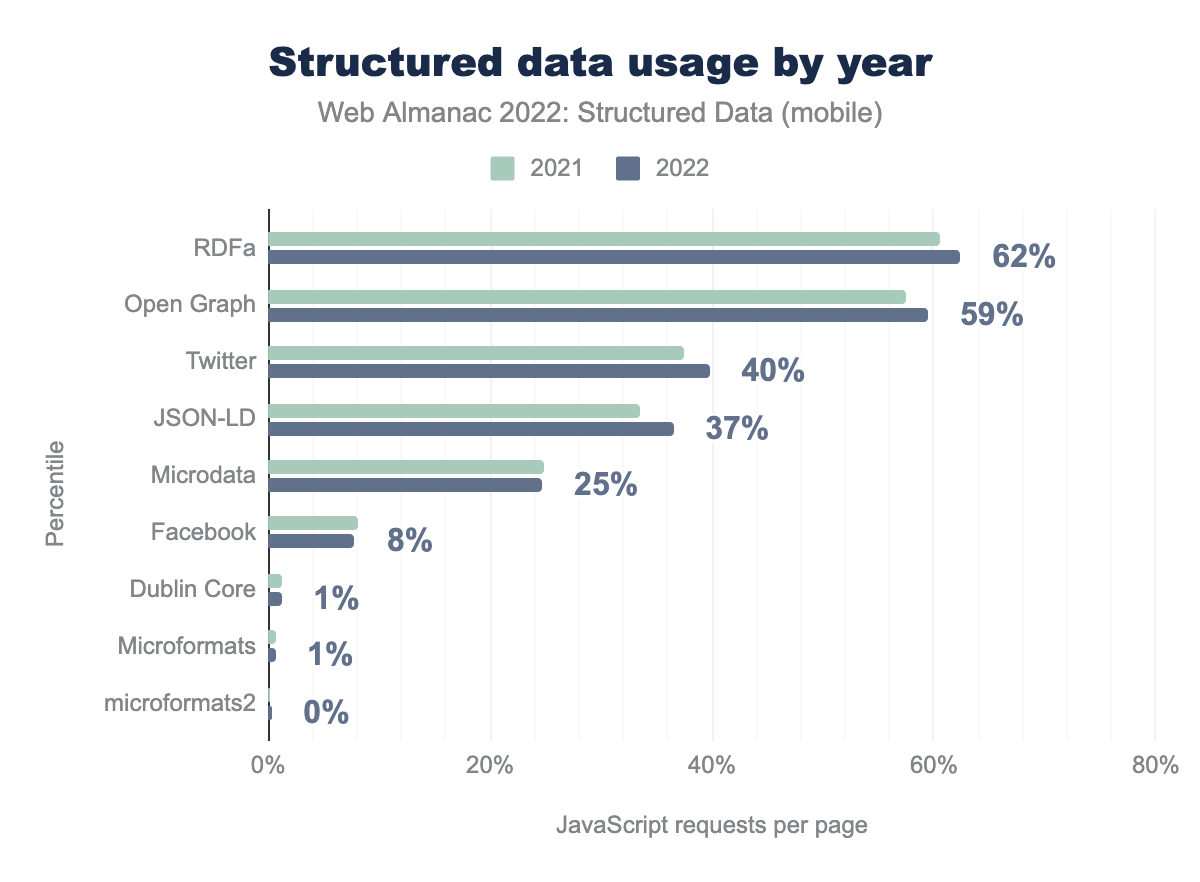 A general increase in these widely-used structured data types can be seen, including Twitter meta tags (which has increased from 37% to 40%) and JSON-LD (which has increased coverage from 34% overall in 2021 to 37% overall in 2022). There is a slight decrease in usage for some of the less prevalent structured data types such as Microdata, Facebook meta tags, Dublin Core and Microformats. Desktop movements were very similar.
