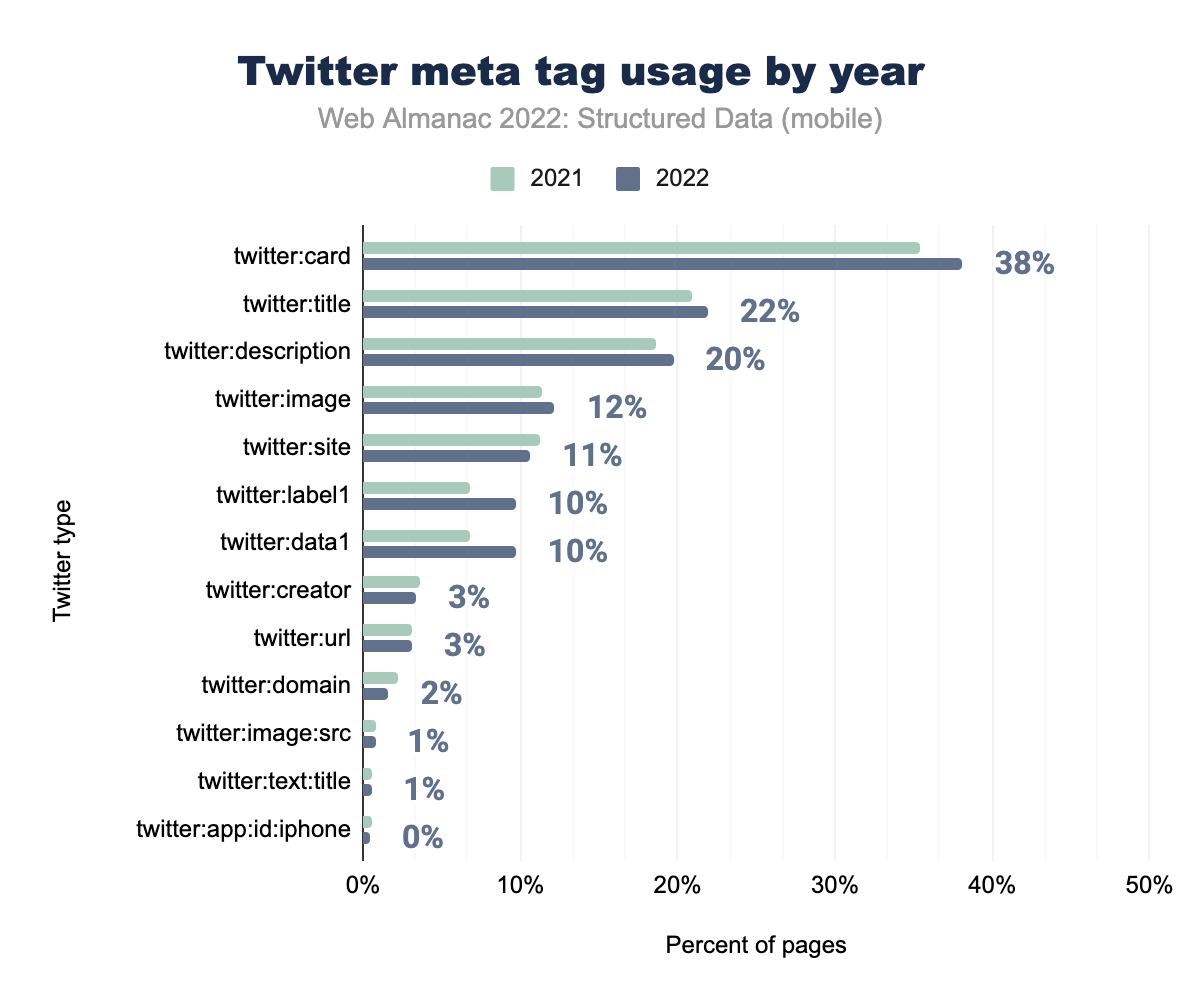 Twitter meta tags once again follow the pattern of a general increase in usage, more specifically in the common tags of twitter:card, twitter:title, twitter:description and twitter:image. A notable increase can be seen for twitter:label1 and twitter:data1, both at 7% in 2021 to 10% in 2022 for mobile pages.