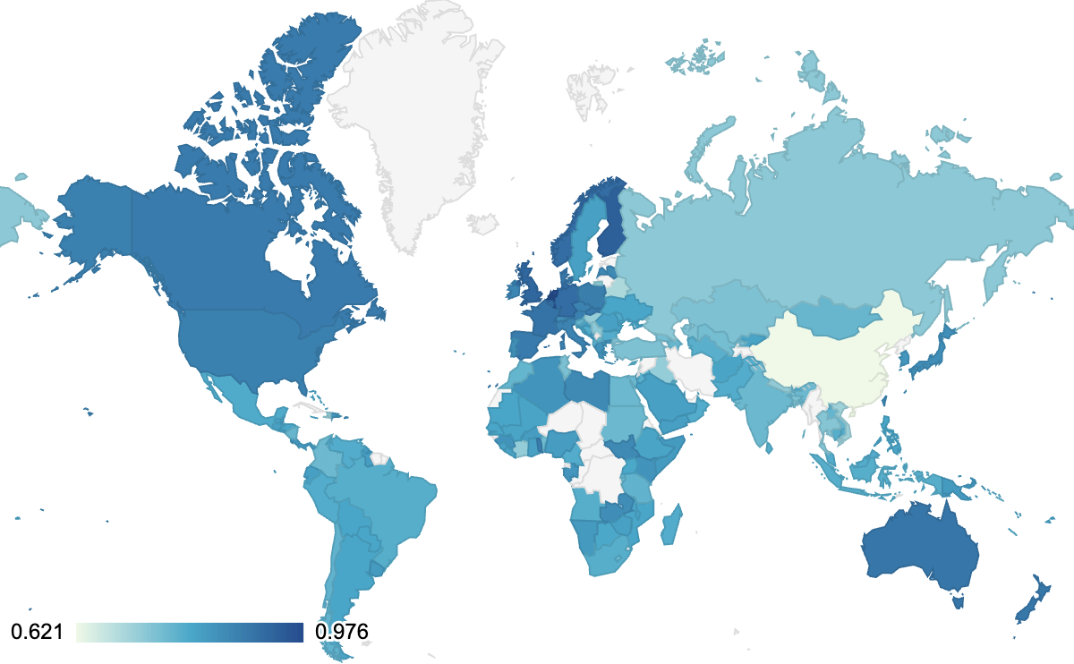 The following map shows the average desktop accessibility score by country top level domain (TLD).