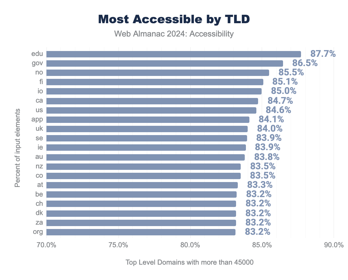 It is worth noting that many sites that operate in the USA are subject to the Section 508 guidelines on accessibility. Organizations are being sued in the USA, under ADA Title III, for not having accessible websites. It is not surprising that the USA is the most accessible country. Other jurisdictions are beginning to penalize companies that sell inside their geography or to their citizens. Increasingly people are looking at the European Accessibility Act and preparing for the new requirements that will be introduced in 2025.