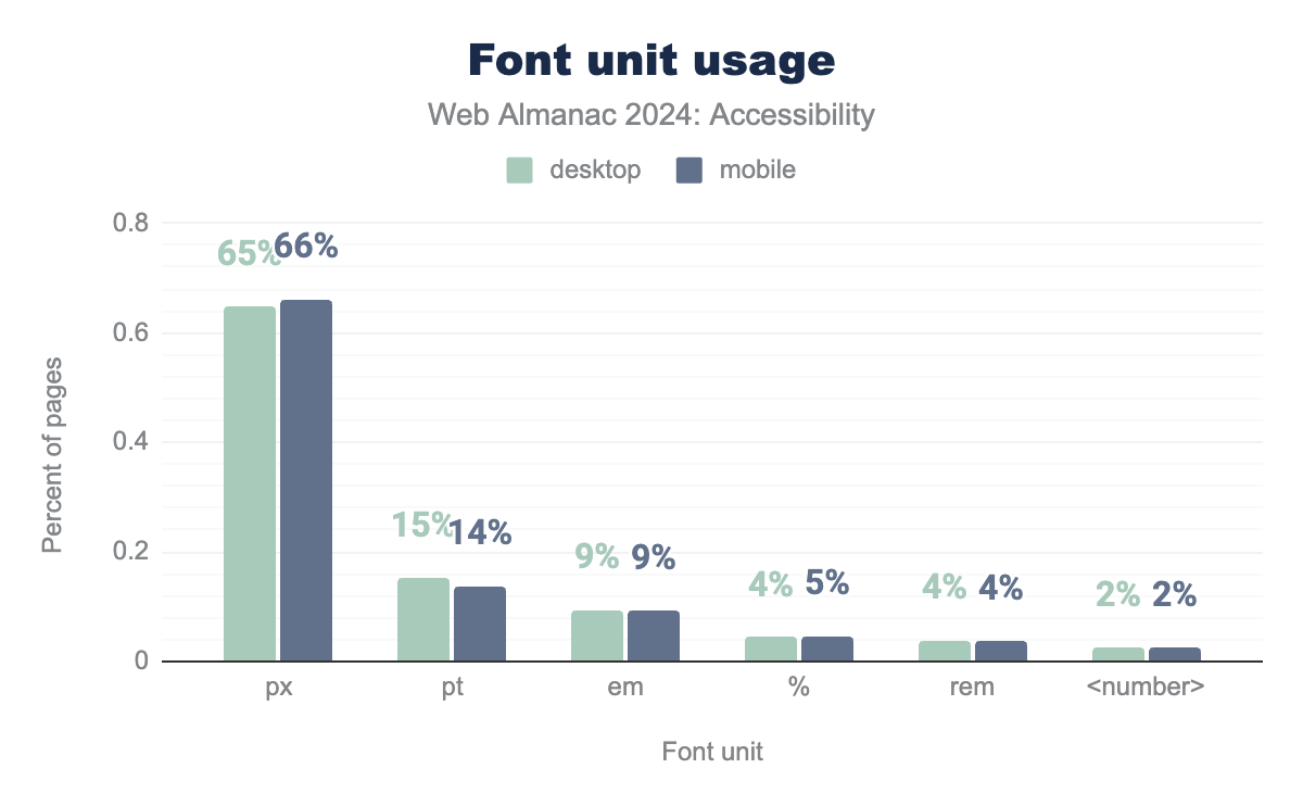 <number> on 2% of both, and finally pt on 15% on desktop and 14% on mobile.How font sizes are defined also affects the readability, as pixels are not as flexible as other units. Pixel (px) use is 65% in desktop and 66% in mobile. The use of em has increased to 9% from 6% in 2022. rem was at 6% in 2022, and has reduced to 4% now. There is not a significant increase in the use of em or rem since 2022, even though it often gives the user a better experience when they increase or decrease their font size in their browser settings.