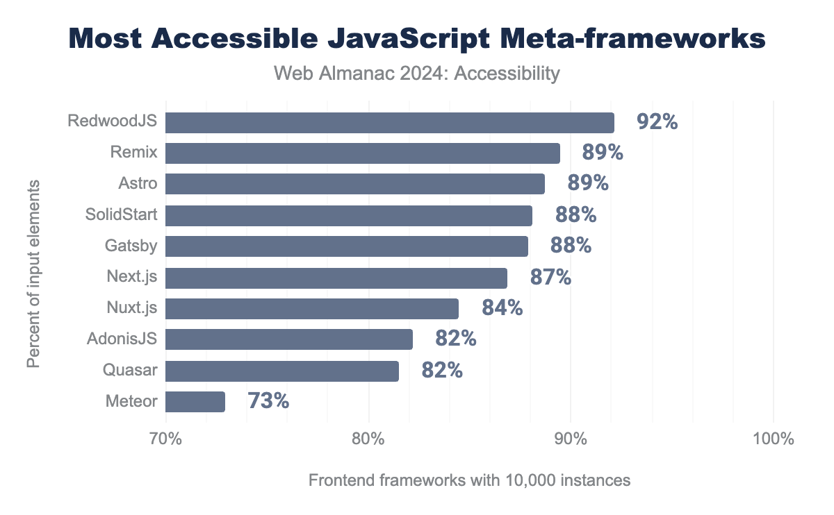 Stimulus, Remix and Qwik are several percent more accessible on average than React, Svelte or Ember.js.