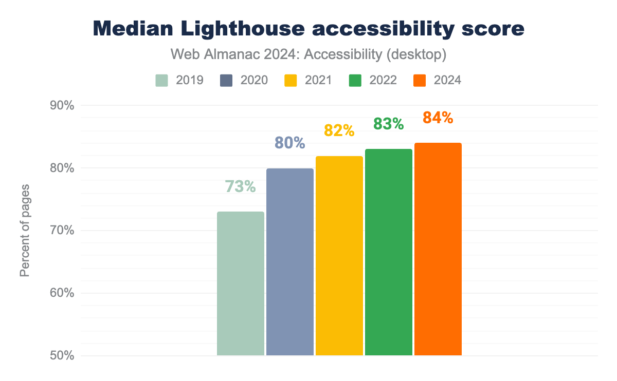 aria-allowed-attr passes on 82% of sites in 2022, and 95% in 2024. aria-input-field-name passes on 14% of sites in 2022, and 21% in 2024. aria-progressbar-name passes on 3% of sites in 2022, and 14% in 2024. color-contrast passes on 23% of sites in 2022, and 29% in 2024. frame-title passes on 36% of sites in 2022, and 51% in 2024.Google Lighthouse now contains 57 different audit tests which they use for their scoring. These are all based on Deque’s open source axe-core, which is widely adopted in a range of accessibility products and services. With the exception of 7 audits (aria-meter-name, aria-toggle-field-name, aria-tooltip-name, document-title, duplicate-id-active, html-lang-valid, and object-alt) there have been improvements across the board. Both object-alt and aria-tooltip-name were called out for their improvements in 2022, but sadly this improvement was not repeated in 2024.
