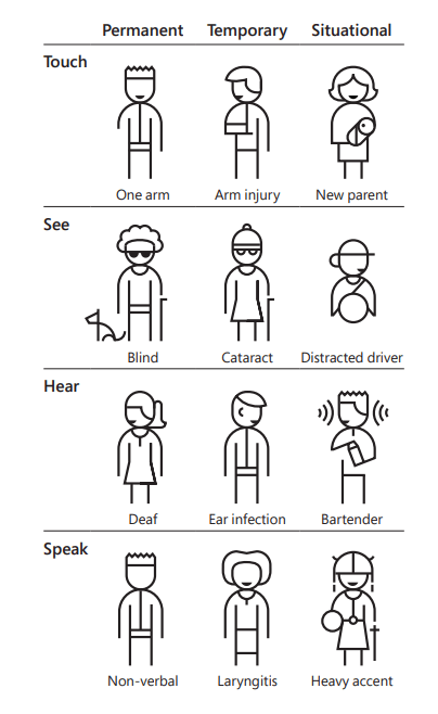 Microsoft’s Inclusive Design Guidelines go beyond permanent disability scenarios and extend them to temporary or situational limitations. Human abilities vary. No matter if a person has lost an arm (permanent), or is wearing a cast because of an accident (temporary) or holding a baby (situational limitation), being able to use the computer or phone with one hand or voice interaction benefits them.