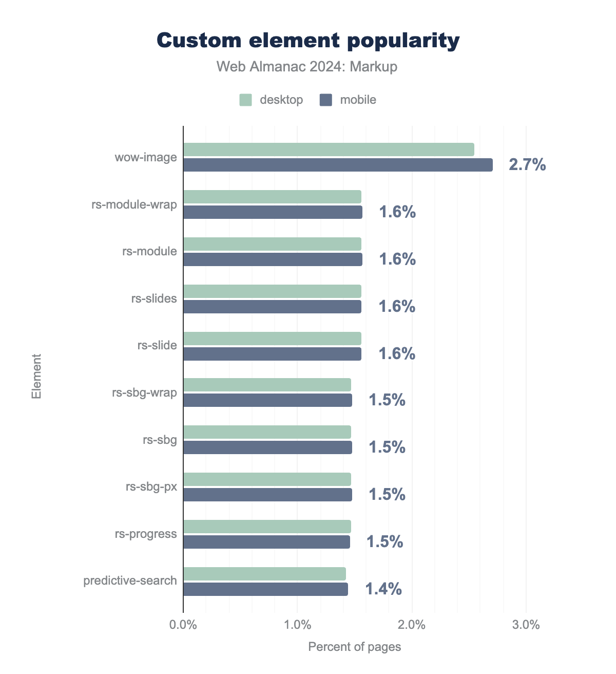 As in the 2022 edition, most of the top 10 custom elements are dominated by rs-* elements from Slider Revolution. However, this year we see a new (and surprising) winner: wow-image element, which is used by the @wix/image package on Wix sites.