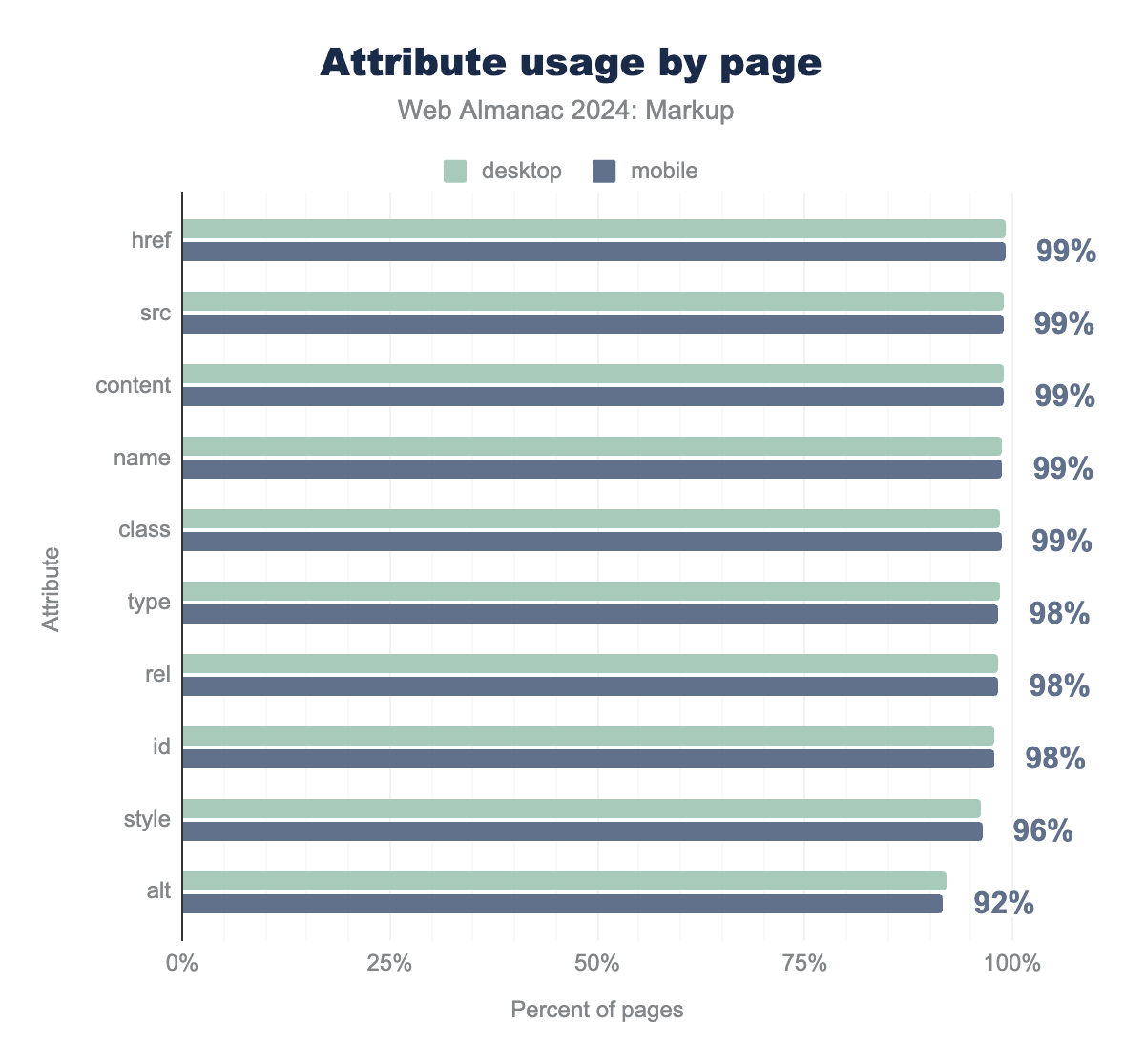 The HTML lang attribute plays an important role in helping screen readers and search engines understand the language of a webpage’s content. However, interestingly, Google Search ignores the lang attribute when determining the language of a page because they’ve identified that “it is almost always wrong”. This may explain why en remains dominant in the dataset, with 44.2% of desktop and 40.5% of mobile pages using it as the primary language attribute, even though the actual language of the content might differ.