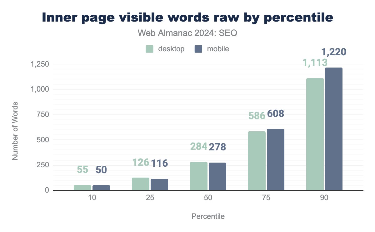Inner pages contain slightly fewer words overall. The median mobile inner page in 2024 had 317 visible words after rendering, while desktop inner pages had 333 words.