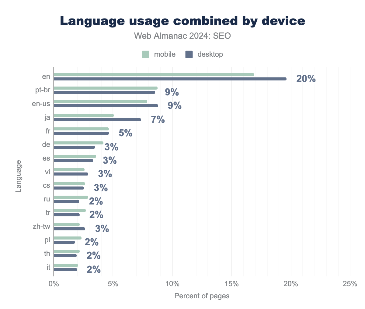 Even though Mandarin is the second most spoken language in the world, the dominant search engine for this language, Baidu, does not require specific tags for locating Chinese websites. As a result, it presents a challenge when collecting data for the language. Still, zh-tw (the Chinese spoken in Taiwan) appears in the 13th position for language usage.