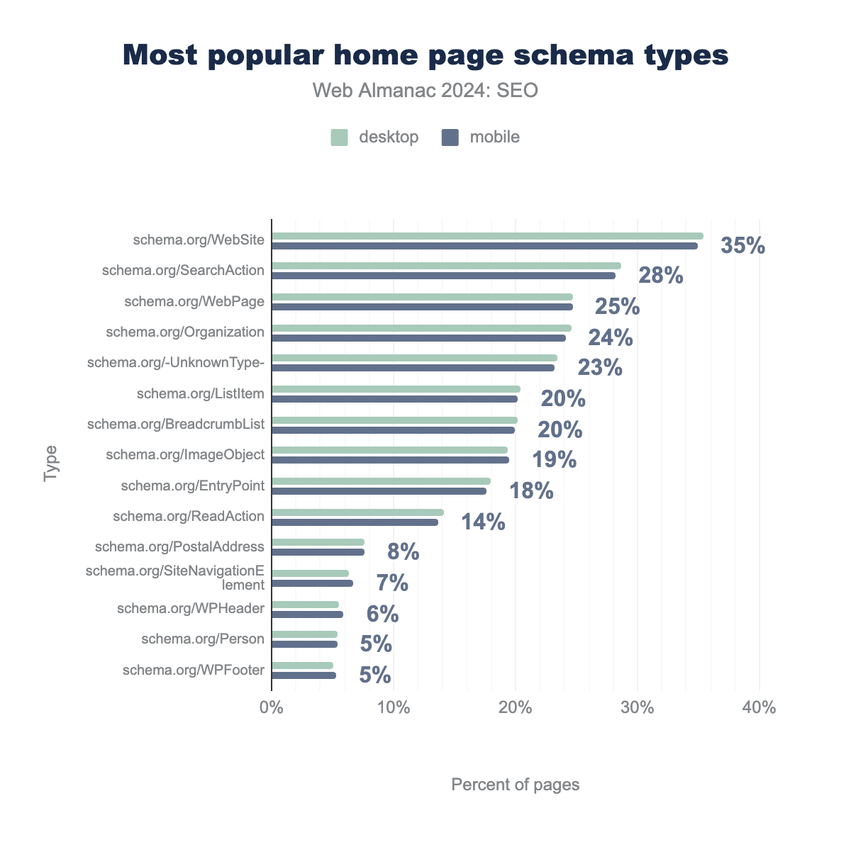 schema.org/WebSite was found on 35%, schema.org/SearchAction on 29%, schema.org/WebPage on 25%, schema.org/Organization on 25%, schema.org/-UnknownType- on 24%, schema.org/ListItem on 20%, schema.org/BreadcrumbList on 20%, schema.org/ImageObject on 19%, schema.org/EntryPoint on 18%, schema.org/ReadAction on 14%, schema.org/PostalAddress on 8%, schema.org/SiteNavigationElement on 6%, schema.org/WPHeader on 6%, schema.org/Person on 5%, schema.org/WPFooter on 5%. For mobile, they were found on 35%, 28%, 25%, 24%, 23%, 20%, 20%, 20%, 18%, 14%, 8%, 7%, 6%, 5%, and 5% of pages, respectively.Compared to 2022, there wasn’t a big shift in 2024 in terms of the popularity of structured data types found on home pages. WebSite, SearchAction, and WebPage remained the three most popular schema types since they power the Sitelinks Search Box on Google.