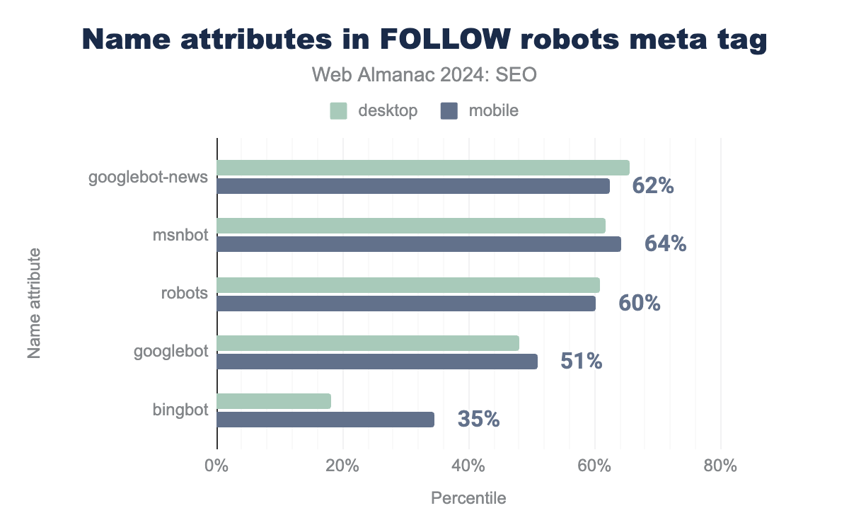 Googlebot-News on 62%, MSNBot on 64%, robots on 60%, Googlebot on 51%, and Bingbot on 35% of applicable pages. Desktop was similar at 66%, 62%, 61%, 48%, and 18% respectively.follow robots meta tag.