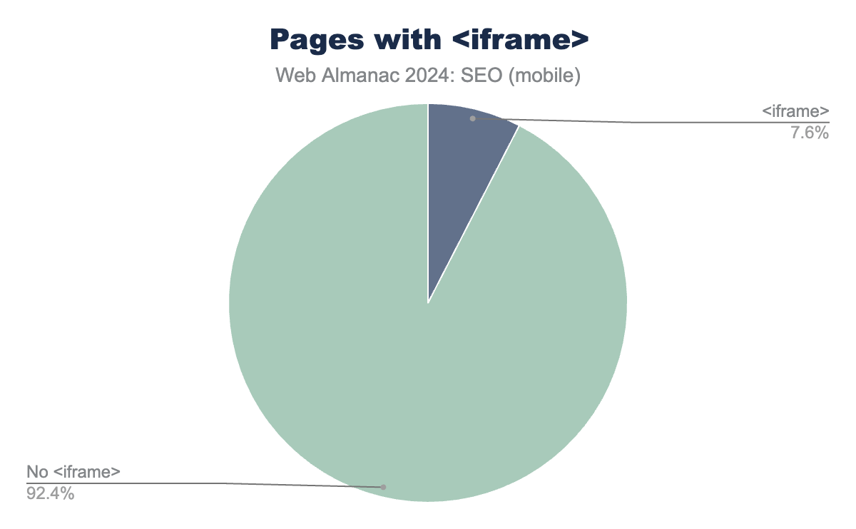 The presence of an <iframe> provides a baseline for cases where the indexifembedded robots directive might be applicable. In 2024, 7.6% of mobile pages contained an <iframe> element. This is a noteworthy increase of 85% from 2022’s rate of 4.1%.
