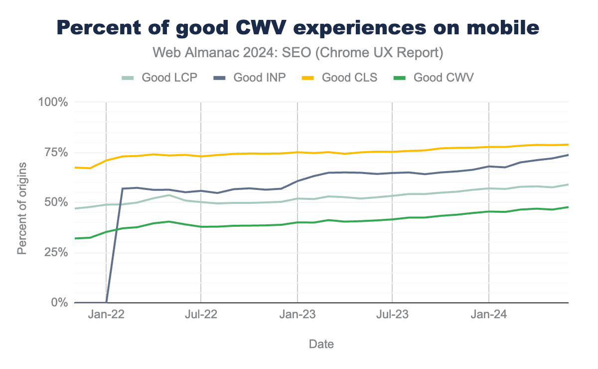 That said, it has not been business-as-usual. The amount of sites passing Core Web Vitals (CWV) has been tremendous, despite Interaction to Next Paint (INP) replacing the arguably much easier to pass metric of First Input Delay (FID). That positive news signals how performance, in general, is being taken more seriously in the SEO industry.