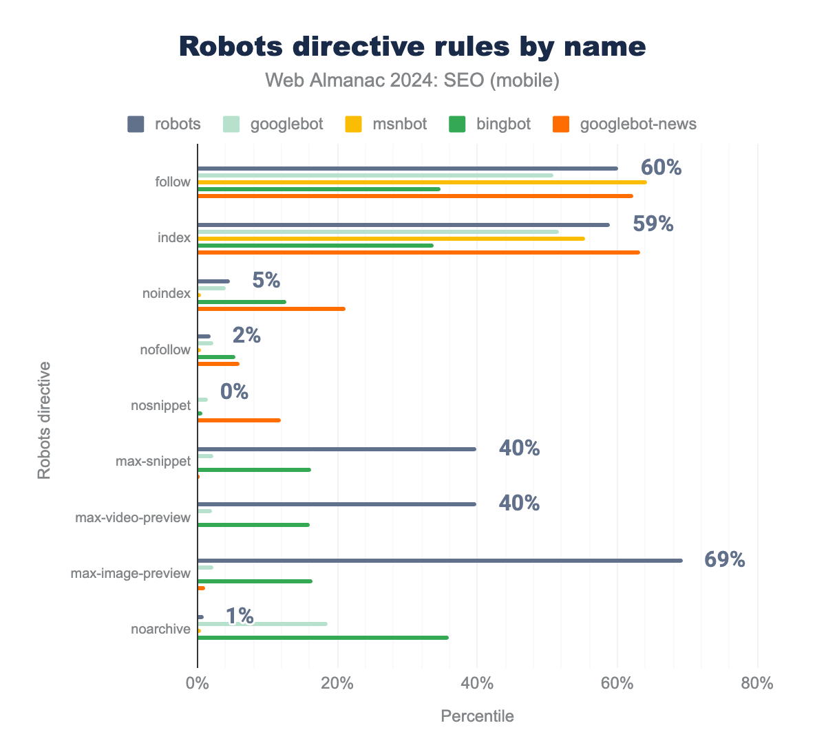 noarchiverule was applied overwhelmingly toBingbotat 36%. This is likely due to the tag’s ability to keep content out of Bing chat answers. max-snippet,max-video-preview, andmax-image-previewrules are widely implemented for all robots at the rate of 40%, 40%, and 69%, respectively.Googlebot-Newswas the most named forindex(63%) andnosnippet(12%)MSNBotwas the least likely to be given anoindexdirective (1%). In comparison, the most likely wasGooglebot-Newsat 21%.- 0.01% of sites provided a